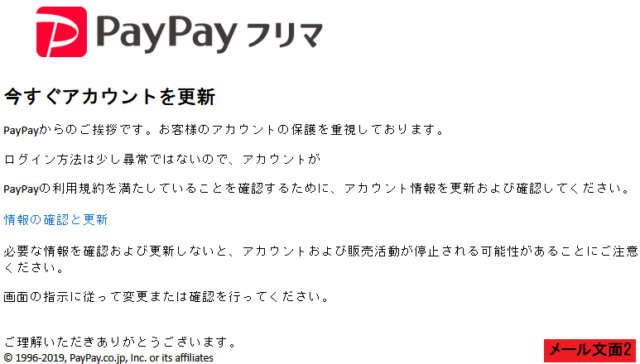 いかにもPayPayのオフィシャルメールを装って、フィッシングサイトへのリンクが埋め込まれています。